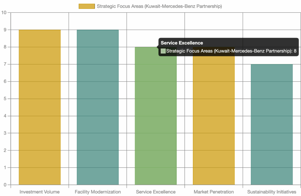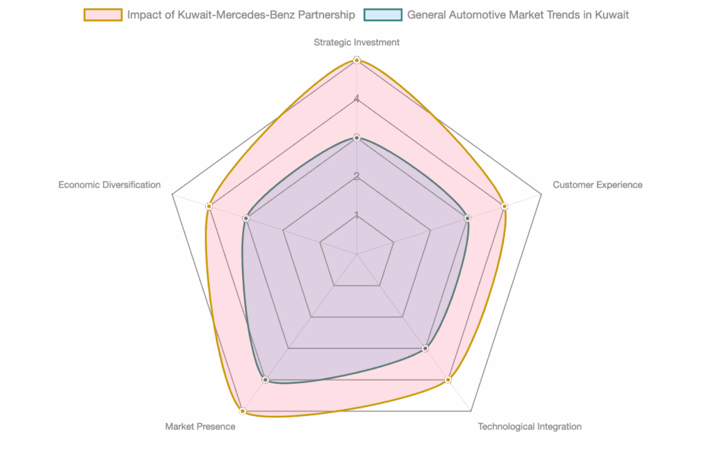 This radar chart illustrates the perceived impact and strengths of the Kuwait-Mercedes-Benz partnership across several key dimensions, compared to general automotive market trends in Kuwait. The partnership demonstrates superior performance in strategic investment, customer experience, and market presence, highlighting its significant contribution to Kuwait’s economic diversification and the integration of advanced technology.